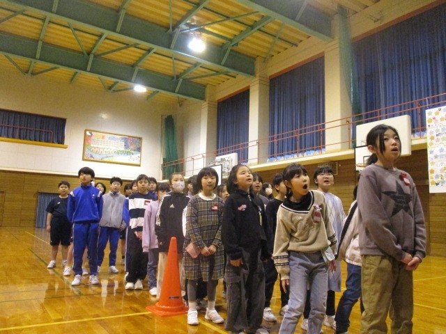 卒業を祝う会や閉校式で歌う「歌よ ありがとう」を全校で歌いました。低音部と高音部の2部合唱が見事に響いていました。両日ともさらにすてきな歌声を届けられることでしょう。