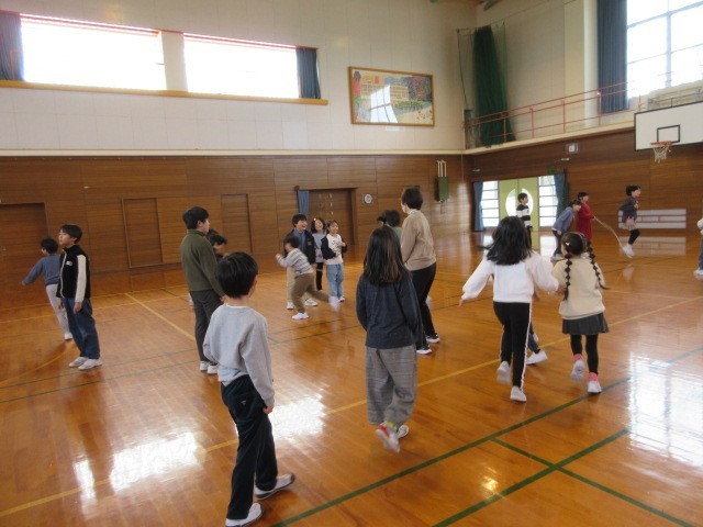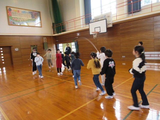 5年生が企画してくれたお祝いプロジェクト。きょうは大縄跳びでした。1~5年生が跳んだ合計回数と6年生が2チームに分かれて跳んだ合計回数で勝負をします。さすがは6年生、どの学年よりも上手に跳んでいました。