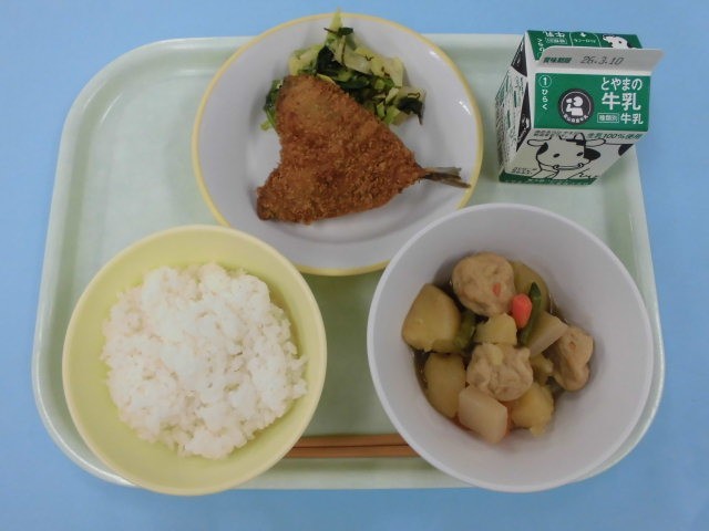 今日の給食は、ごはん、牛乳、あじフライ、昆布和え、関東だきです。