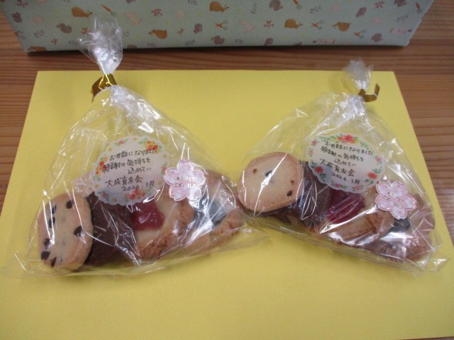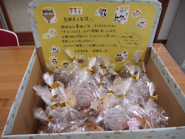 大成育友会様より、教職員へ心温まるクッキーのご寄贈をいただきました。いただいたお菓子には、一つひとつ手書きのメッセージが添えられており、そのお心遣いに教職員一同、深く感激いたしました。育友会の皆様のご厚意に心より感謝申し上げます。誠にありがとうございました。