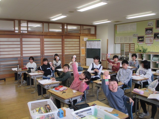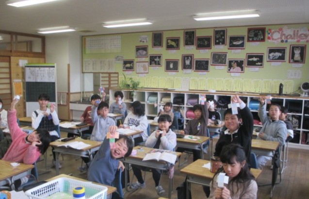 4年生最後の算数科の学習は「箱の形の特ちょうを調べよう」です。直方体と立方体の違いを理解してから、展開図をかいて実際に立体を作ってみました。みんな上手く作ることができて、とてもうれしそうでした。