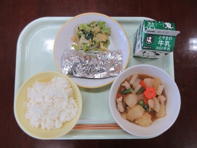きょうの給食は、ごはん、牛乳、鯖の銀紙焼き、ごま和え、じゃがいもと鶏肉のうま煮です。