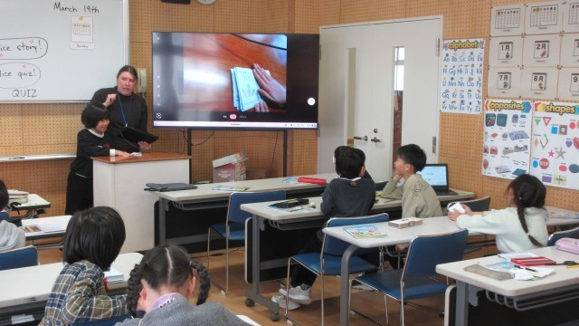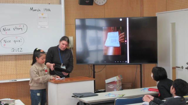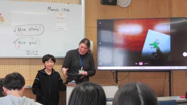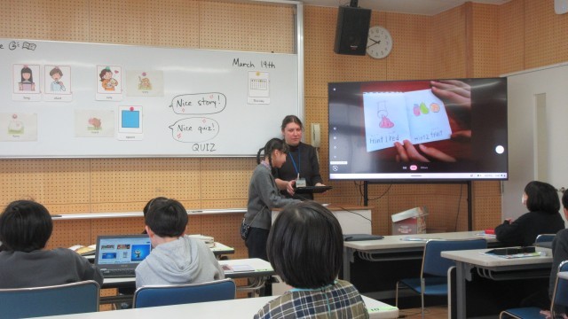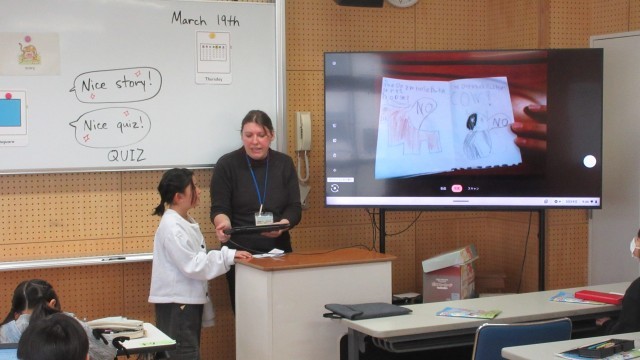 今日は、作ったストーリーブックを紹介しました。いろいろな動物が登場したり、クイズ形式になっていたりして、とても楽しく見ることができました。最後に、みんなでALT の先生に英語で感謝の気持ちを伝えました。