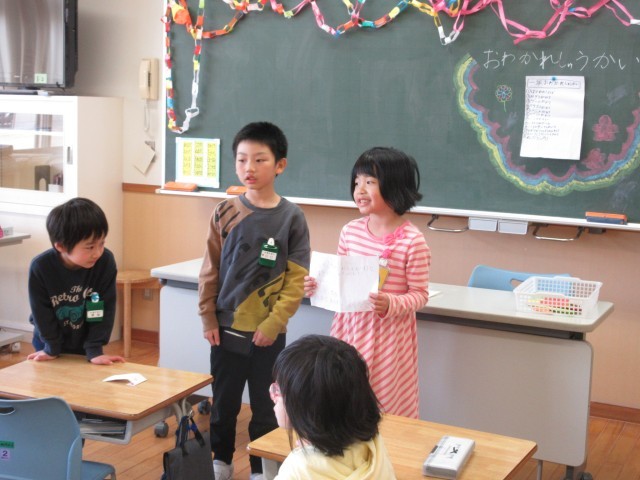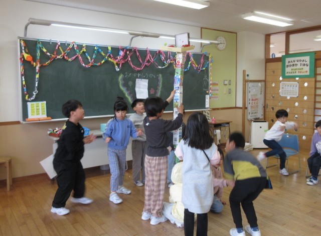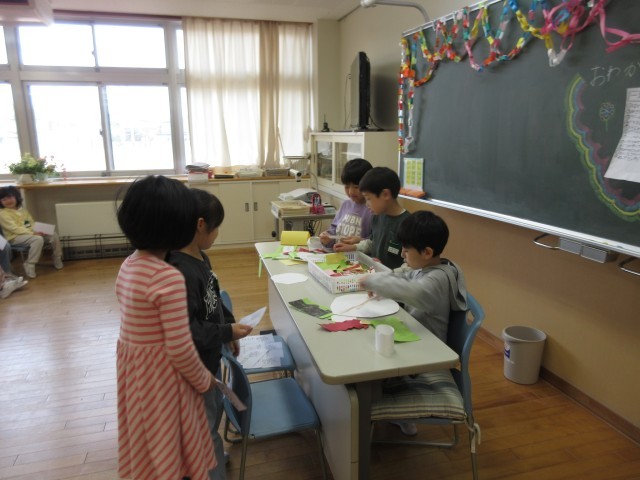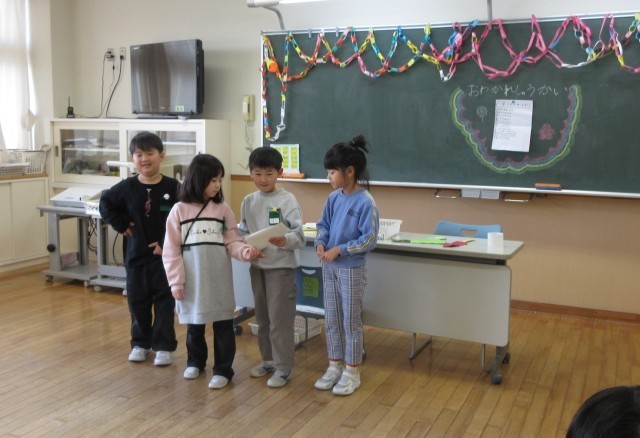 1年花組のお別れ集会をしました。やきそば屋さん、玉入れ、宝探し、クイズなどそれぞれの係で出し物を考えました。イベント係が中心になり、おにごっこやハンカチ落としなど盛りだくさんの楽しい集会になりました。
