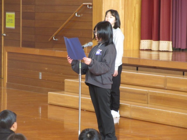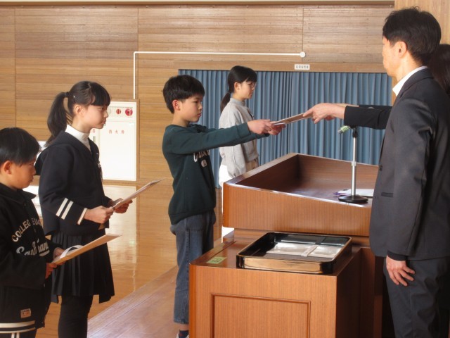 修了式が行われました。代表児童が元気よく返事をして、校長先生から修了証を受け取りました。がんばったこと発表では、代表児童が行事でがんばったことを立派に発表しました。1年間、学級で全校で、そして校外でのさまざまな学習や活動に全力で取り組んできた4年生。水橋学園でも、水橋中部小学校で学んだこと、思い出、これまでの仲間との絆を大切に様々なことにチャレンジしていってほしいと思います。