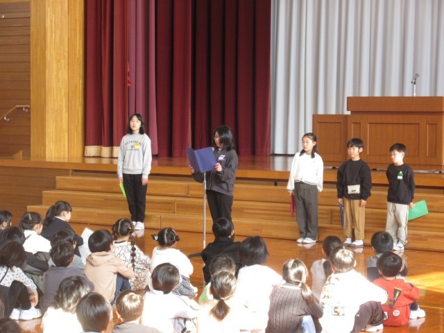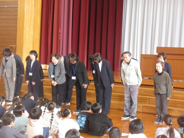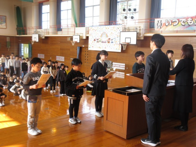 本校での最後の修了式がありました。はじめに、校長先生から学年の代表の児童に修了証が渡されました。その後、各学年の代表児童ががんばったことを発表しました。この一年間を振り返り、学習や学校行事等でがんばったことを堂々と発表することができました。最後に、全職員が子供たちにメッセージを伝えました。水橋学園に進んでも、水橋中部小学校で培った「大成の心」を胸にがんばってください。