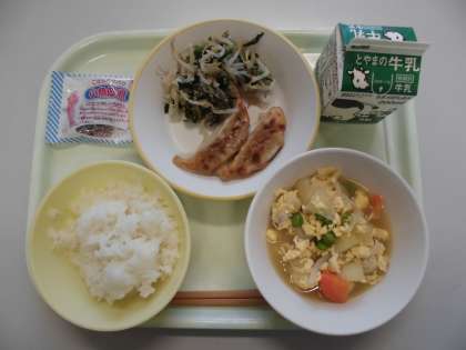今日の給食は、ごはん、牛乳、卵とじ、焼き餃子、塩ナムル、しらすのつくだ煮 です。