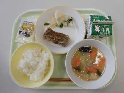 今日の給食は、ごはん、牛乳、魚のごまだれかけ、かぶのいろどり、具だくさん汁、黒糖大豆です。