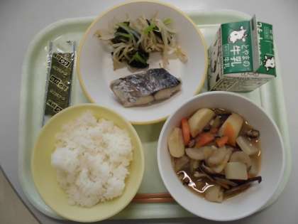 今日の給食は、ごはん、牛乳、鰆の塩焼き、生姜ひたし、のっぺい、味付けのりです。