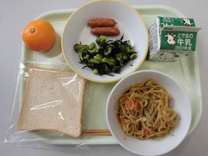 今日の給食は、減量食パン、牛乳、いかやきそば、ウインナー、ひじきのマリネ、みかんです。
