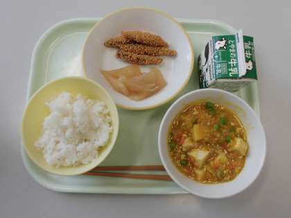 今日の給食は、ごはん、牛乳、きびなごのさくさくあげ、こんにゃくのゆずみそあえ、冬至のそぼろあんです。