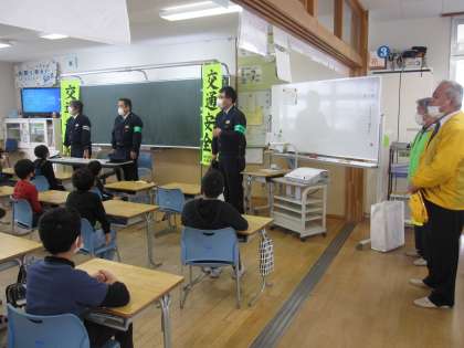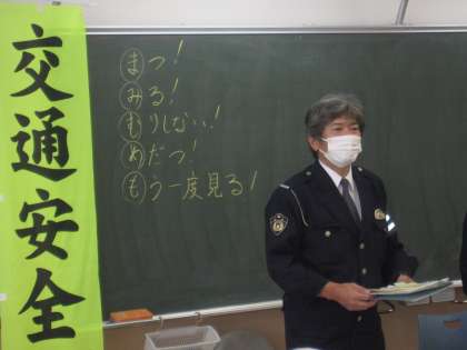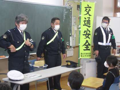 富山中央署交通課企画係長・佐伯さん、水橋交番より交番長・上嶋さん、竹山さん、交通安全協会より廣瀬さん、直江さんがおいでになり、交通安全教室を行いました。