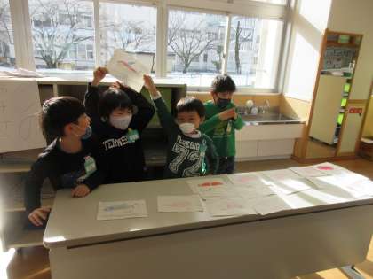 国語科「ものの名まえ」の学習で、おみせやさんごっこをしました。すし、くだもの、おもちゃ、パン等のいろいろなお店を開きました。どのお店も「いらっしゃいませ。」「○○をください。」「ありがとうございます。」といったお店屋さんとお客さんの言葉のやりとりが聞こえ、とても楽しく活動していました。
