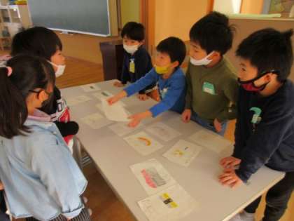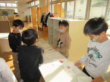 国語科「ものの名まえ」の学習で、おみせやさんごっこをしました。すし、くだもの、おもちゃ、パン等のいろいろなお店を開きました。どのお店も「いらっしゃいませ。」「○○をください。」「ありがとうございます。」といったお店屋さんとお客さんの言葉のやりとりが聞こえ、とても楽しく活動していました。