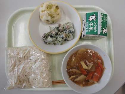 今日の給食は、ソフト麺、ごもくあんかけ、ビーンズサラダ、むしパンです。