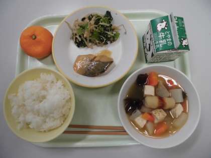 献立は、ごはん、さむらいのおでん、さばのみそ煮、ごまあえ、みかん、牛乳です。