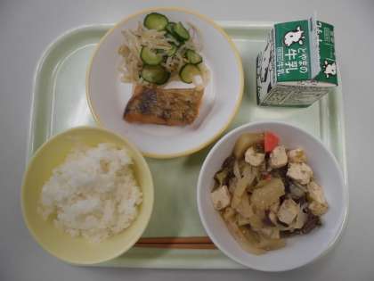 今日の給食は、ごはん、牛乳、あげ魚のレモン味、塩ナムル、牛肉と大根のごますき煮です。