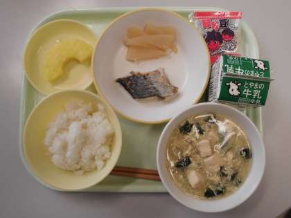 今日の給食は、ごはん、牛乳、さわらの塩焼き、あんばやし、中華かきたま汁、カットパイン、節分豆です。