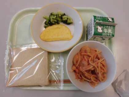 今日の給食は、減量食パン、牛乳、オムレツ、ゆでブロッコリー、えびとトマトのクリームスパゲティです。