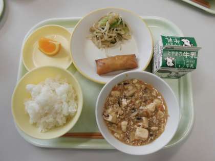今日の給食は、ごはん、牛乳、春巻き、ナムル、マーボー豆腐です。