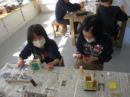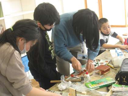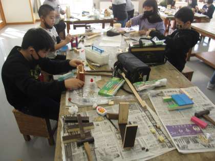 のこぎり、金づち、くぎ等を使って、思い思いのものをつくっています。
