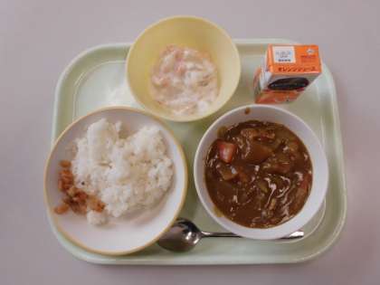 今日の給食は、カレーライス、オレンジジュース、福神漬け、フルーツヨーグルトです。