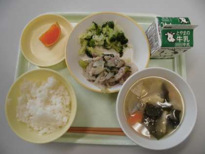 今日の給食は、ごはん、牛乳、豚肉の塩こうじ炒め、そえ野菜、五目みそ汁、せとかです。