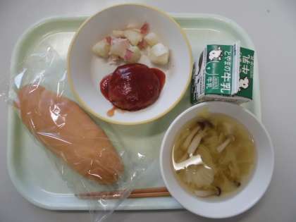 今日の給食は、コッペパン、牛乳、ハンバーグのケチャップ煮、ジャーマンポテト、キャベツスープです。