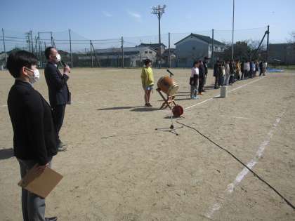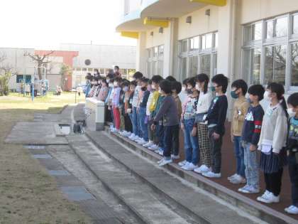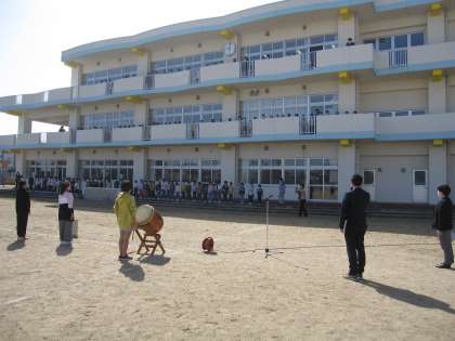 よい天気で、6年生はグランド、在校生はベランダに出てお別れ会を開きました。