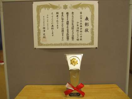 少年消防活動で表彰 公開日 2021/03/18 更新日 2021/03/18 活動の様子 少年消防活動で表彰を受けました。 平和学習の中でつくった防災頭巾が、評価されたのでしょうか。 いただいたトロフィの重いこと!