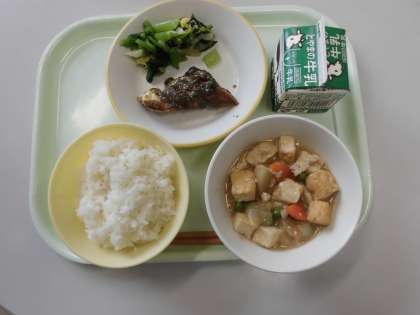今日の献立は、ごはん、牛乳、魚のえごま味噌かけ、はくさいひたし、あつあげと豚肉の煮物です。