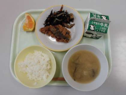 今日の献立は、ご飯、味噌汁、魚の利休揚げ、ひじきの炒め煮、清見オレンジ、牛乳です。