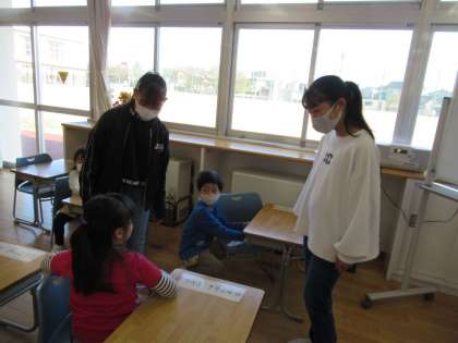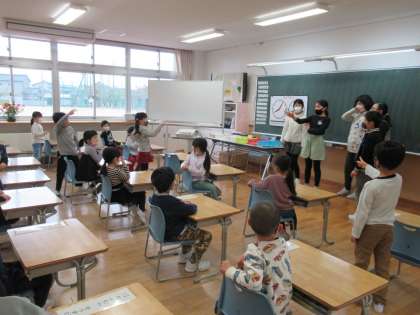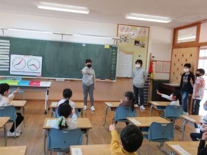6年生は、1年教室に行き、朝の準備を手伝ったりゲームをしたりしています。「どうしたら1年生が楽しんでくれるか」と一生懸命考えています。優しいお兄さん、お姉さんとして活躍しています。