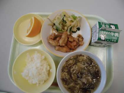 今日の献立は、ごはん、牛乳、鶏肉と高野豆腐のねぎソースかけ、チンゲンサイひたし、卵ともずくのスープ、サンフルーツです。