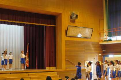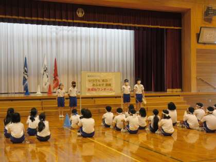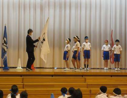 本日、運動会に向けた団の結団式を行いました。結団式では、運動会のスローガン発表の後、各団の団長に団旗の授与がありました。また、各団の応援団長のかけ声のもと、意気込み披露がありました。密を避けるために、教室でリモート参加していた1〜4年生も応援団長の声に合わせて大きな声で意気込みを披露することができました。