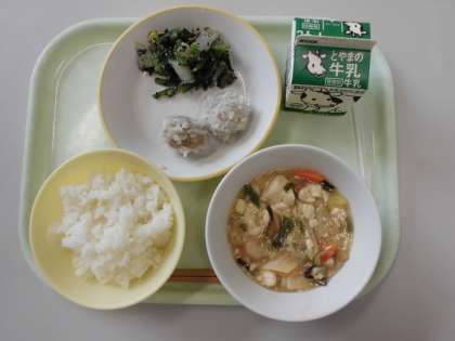 今日の給食は、ごはん・牛乳・よごし・もちごめシューマイ・えびと豆腐のうま煮です。