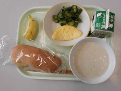 今日の給食は、米粉コッペパン・牛乳・ビーンズポタージュ・グリーンサラダ・オムレツです。