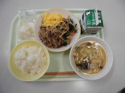 今日の給食は、ごはん、ビビンバ(・やきにく・ナムル・きんしたまご)、中華スープ、牛乳です。