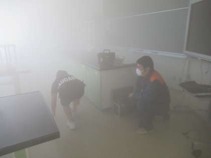 防火教室では、煙を充満させた理科室に入り、煙の中を進む体験をしました。子供たちは、煙の中で動く大変さを実感していました。