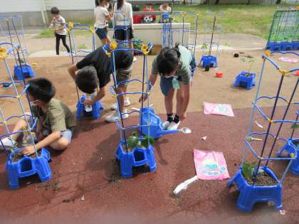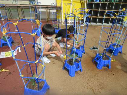 子供たちが、自分の育てたい野菜を選び、苗を植えました。毎朝、水やりをして「大きくなあれ」と大切に育てています。