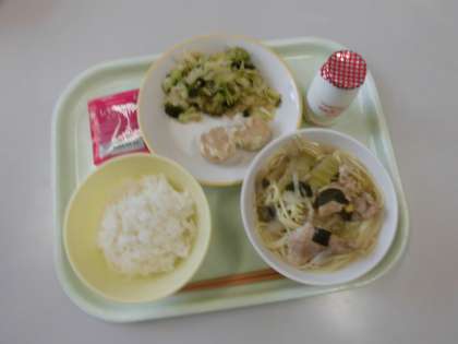 今日の給食は、ごはん、飲むヨーグルト、サッポロラーメン、かにシューマイ、ブロッコリーサラダ、しそかつおふりかけです。