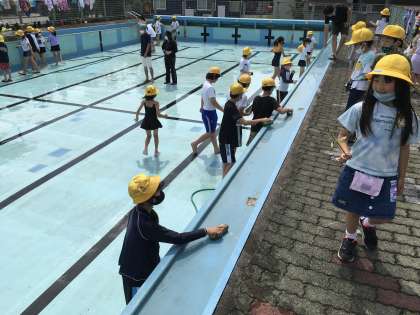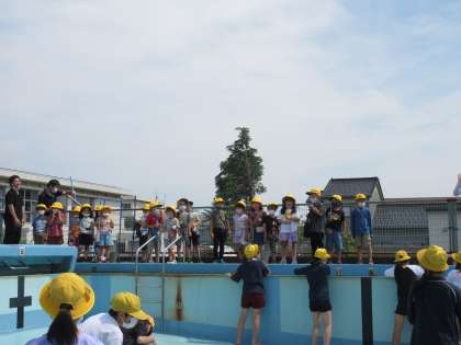また、プールの中をがんばって掃除をしている5・6年生にエールを送りました。
