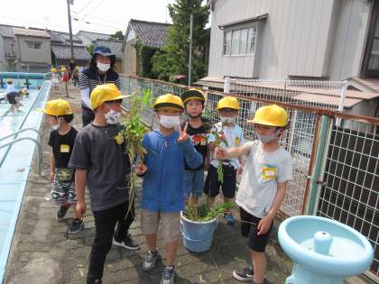 1年生のみんなでプールサイドの草むしりをしました。きれいなプールサイドを目指すために一生懸命取り組みました。