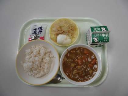 今日の献立は、麦ごはん、かみかみカレー、ゆで卵、切干大根のサラダ、味付け小魚、牛乳です。