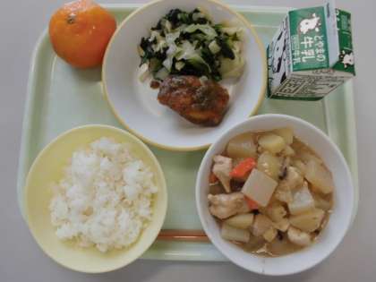 今日の給食は、ごはん、牛乳、魚のえごま味噌かけ、小松菜ひたし、鶏肉とじゃが芋の胡麻煮、冷凍みかんです。