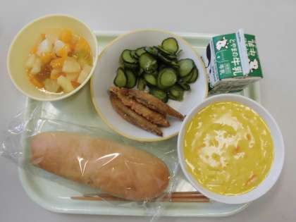 今日の給食は、コッペパン・牛乳・かぼちゃポタージュ・グリーンサラダ・わかざぎのフリッター・フルーツゼリーミックスです。わかさぎのフリッターは、外はカリカリ、中はふわふわでとてもおいしいです。まるごと揚げてあるので、カルシウムがたっぷりです。フルーツゼリーミックスも暑くなってきた今の季節にぴったりですね。