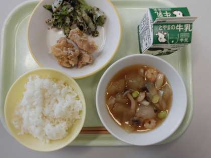 今日の給食は、ごはん、鶏肉のから揚げ、よごし、冬瓜の吉野煮、牛乳です。