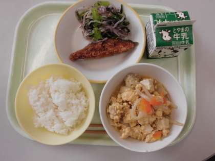 今日の給食は、ごはん、牛乳、魚の竜田あげ、ゆかりあえ、親子煮です。