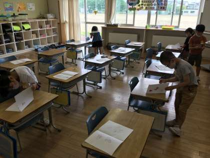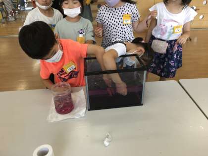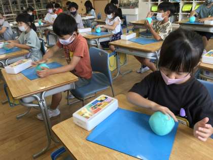 図工でねんどを使っていろいろな形を作ったり、朝顔の花で色水作りや叩き染めをしたりしました。