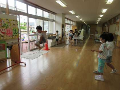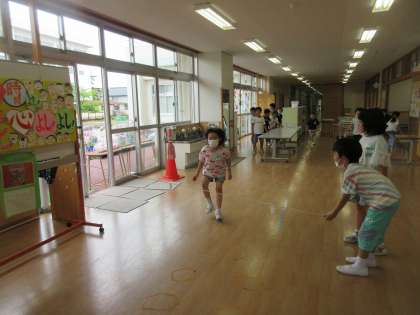 雨の日も、男子と女子が一緒にオープンスペースで遊んでいます。長縄、ゴム跳び等・・笑顔がいっぱいです。